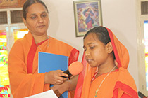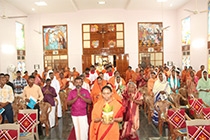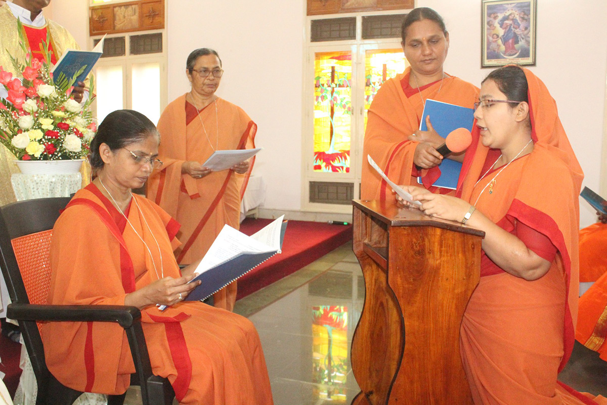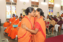 Most Rev. Ch. Bhagyaiah, the Bishop of Guntur officiated the Holy Eucharistic celebration. After the homily the Rite of a Perpetual Profession began when our two sisters prostrated before the altar of God surrendering themselves to God Almighty as the litany of the Saints was sung. They pronounced their vows individually in the presence of Sr. Tresa K Provincial Superior and she accepted their vows in the name of the Church and the Congregation. Then the Bishop blessed the rings and presented the rings to sisters making perpetual profession as a symbol of their commitment to God forever.