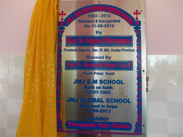 The JMJ Global School was started in the premises of JMJ Convent, Tenali on 31st May 2013. It was inaugurated by Rev. Sr. Regina Chinappan the provincial superior of Guntur Province and was blessed by Rev.Fr. Sleeva C.ss.R the parish priest.